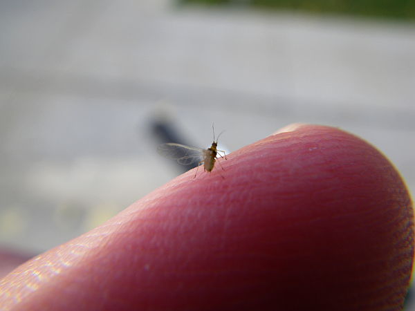 My shirt was covered with them. Nice thing about getting a photograph on a piece of fabric is you can determine later exactly how big the subject is.  This little guy is three millimeters from front of head to rear wingtip.