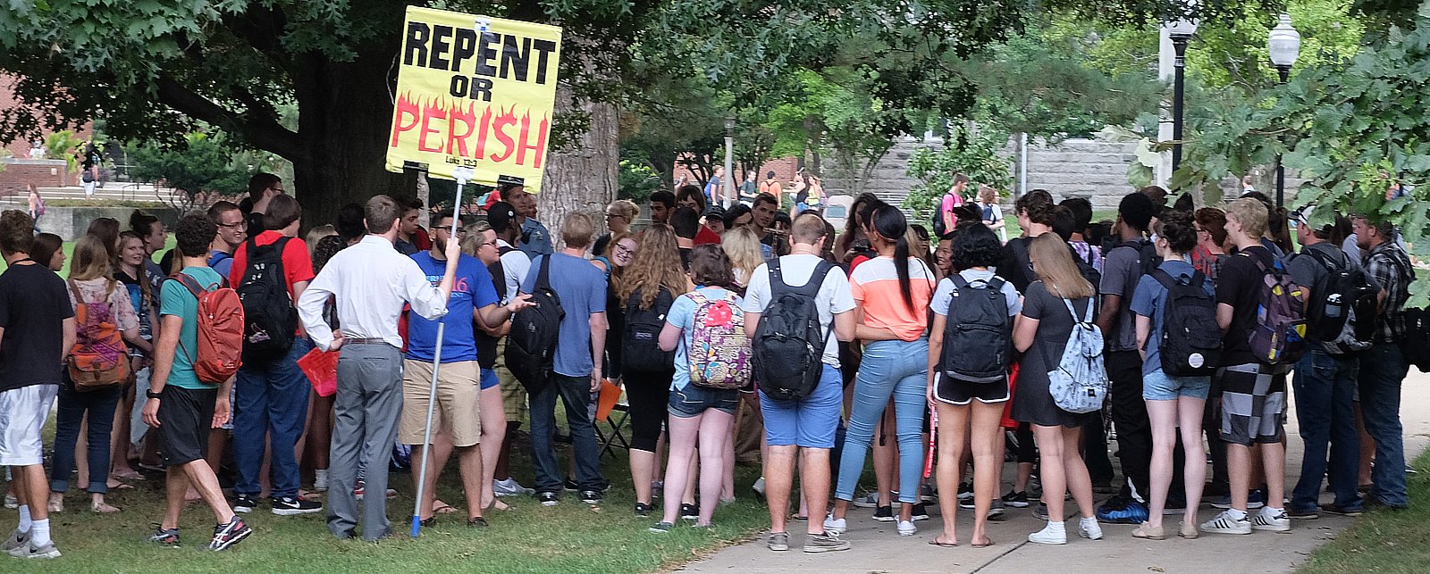 “Brother Jeb” is a fixture on our campus; he and his crew visit a couple times a year to warn of the dangers of sin. Holding a crucifix on a sturdy hickory pole, he looks every bit the modern prophet, telling onlookers that God knows when they smoke pot, watch porn, or have impure thoughts. Eternal punishment awaits!