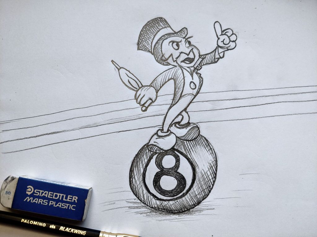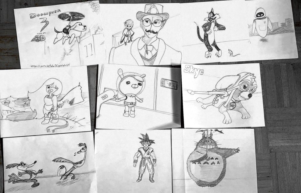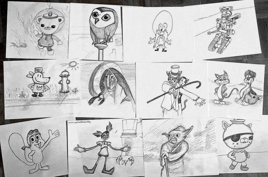 These are quick sketches that I do every day to improve my drawing ability. It’s practice, not original art; freehand drawings of someone else’s artwork. Similar to sitting in an art museum painting Renaissance works, only I prefer cartoons to classics.