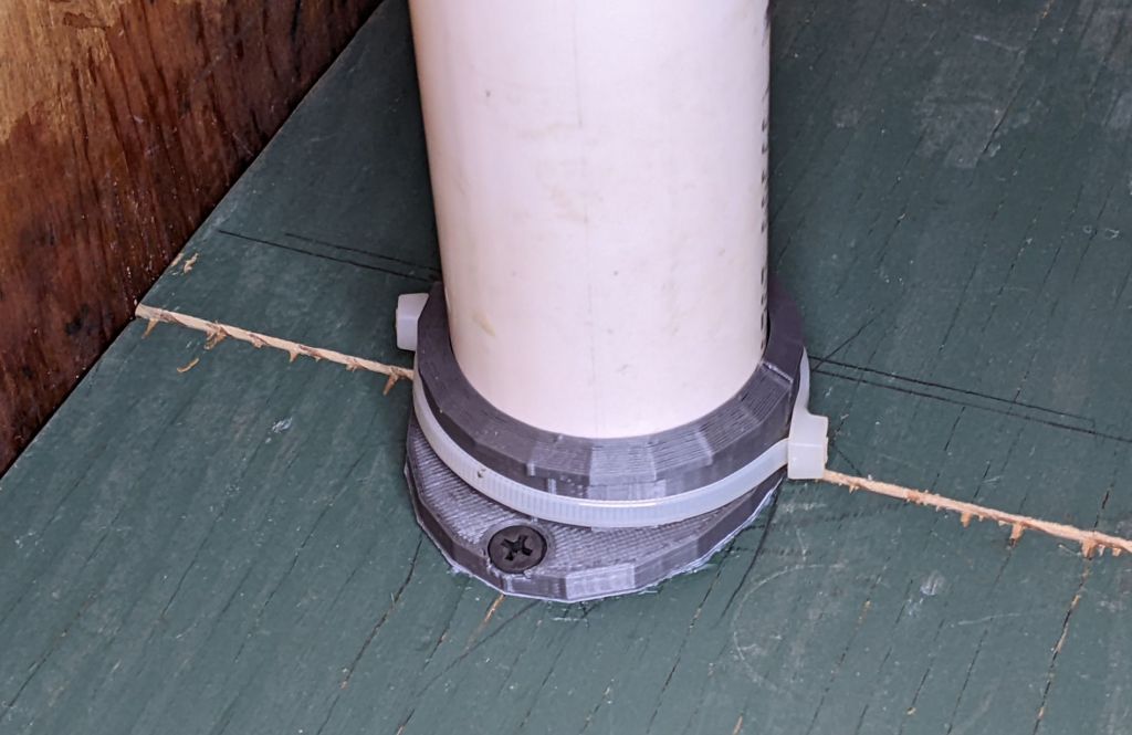 Then I had to modify the floorboard of the sink cabinet. I drilled a hole then cut it across the middle of the hole. Then I designed a 2-piece flange and put it on the 3D printer. While that was printing, I painted the damaged floor under the sink with some polyurethane.