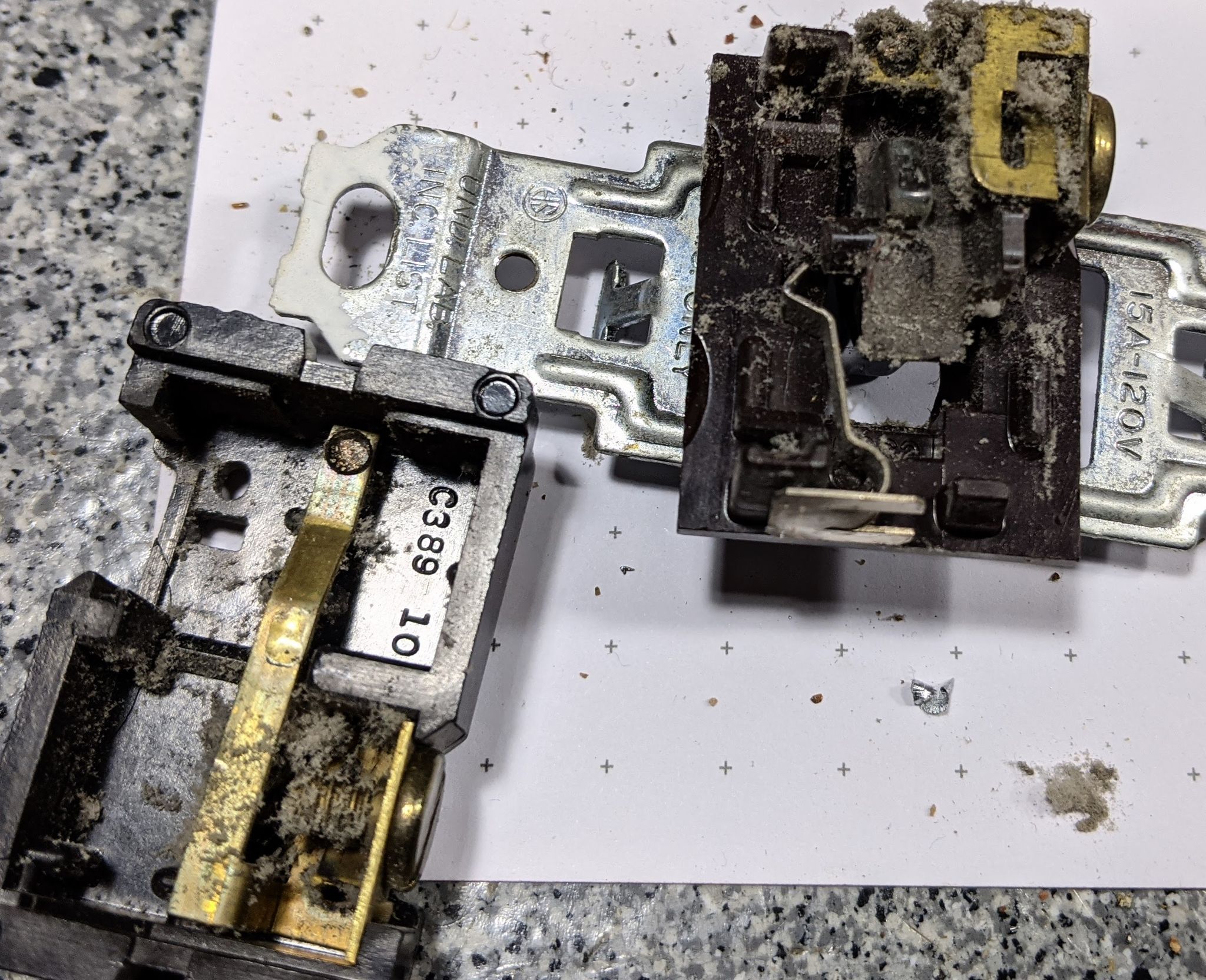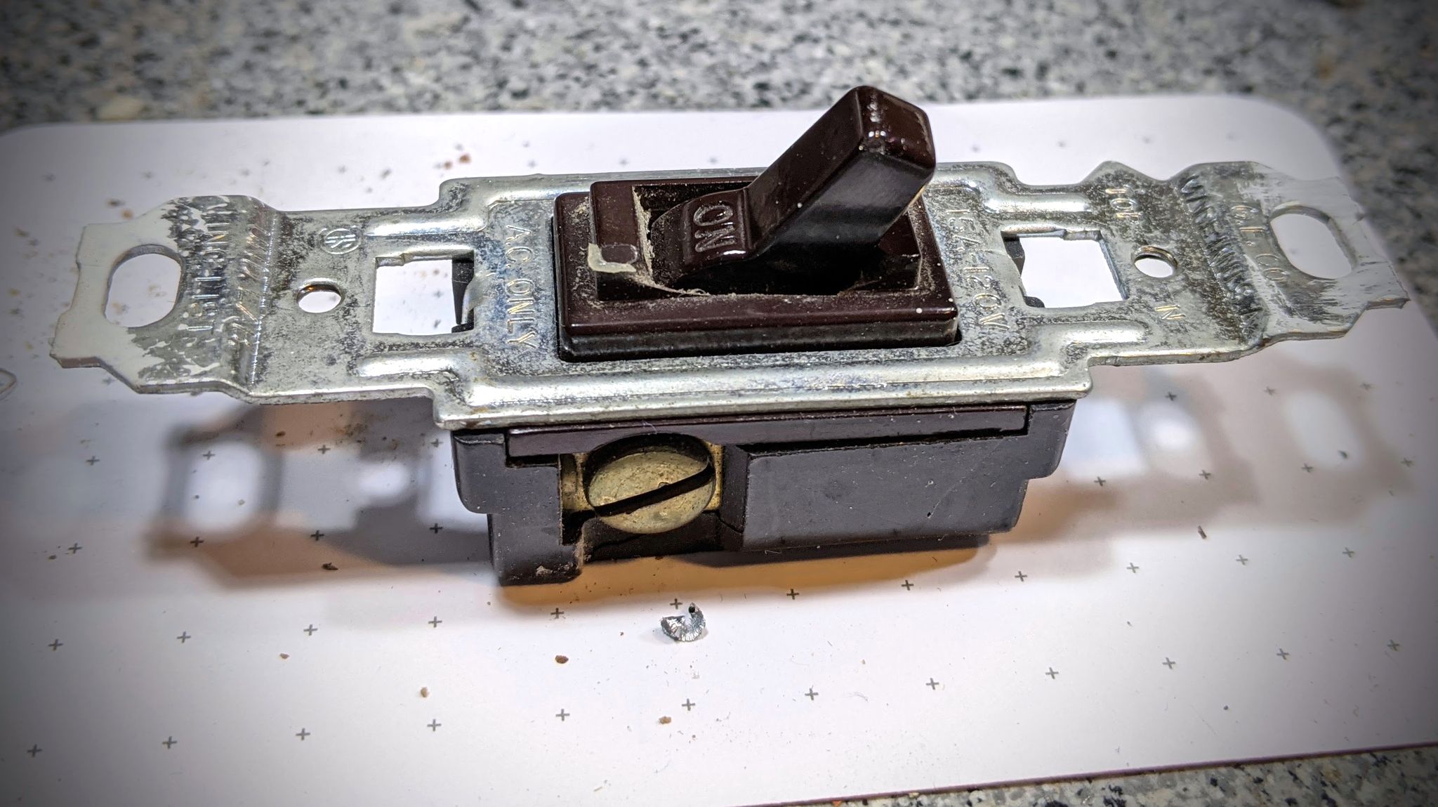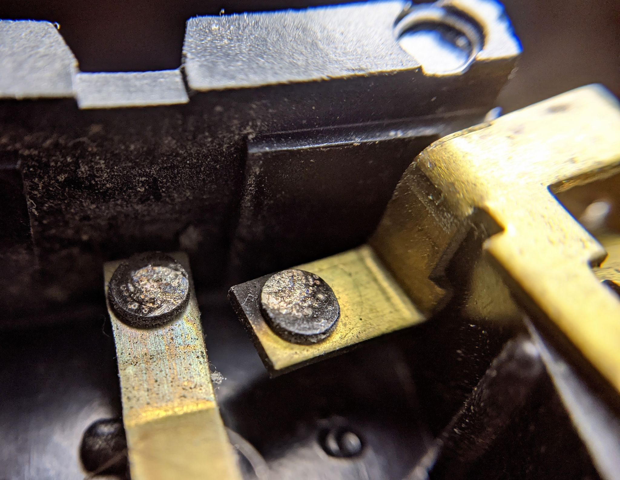 So here’s the switch, made about 45 years ago by the GE corporation. Let’s take it apart!Over long periods of time, dust in an old house works its way into everything, including electrical switches. The dust causes poor conduction in the switch contactsHere are the switch contacts, normally facing one another. But I’ve flipped one over so we can see them both.In extreme close-up, we can see that the result was an electric arc where the dust interfered with switch contact. Notice that the brass is discolored from heat, and some of the metal face of the contacts has been vaporized. Most interesting, one of the contacts, which are 3 mm in diameter, got so hot it developed a circular crack around the point of poor contact. This is normal switch wear. It only takes about five minutes to replace a switch though and it’s a couple bucks. So no biggie.I won’t lie, it took multiple attempts to get a passable photo of those 3mm contacts. In operation, the short contact is flipped so it is facing the long contact, which is moved by a molded cam on the switch lever itself.